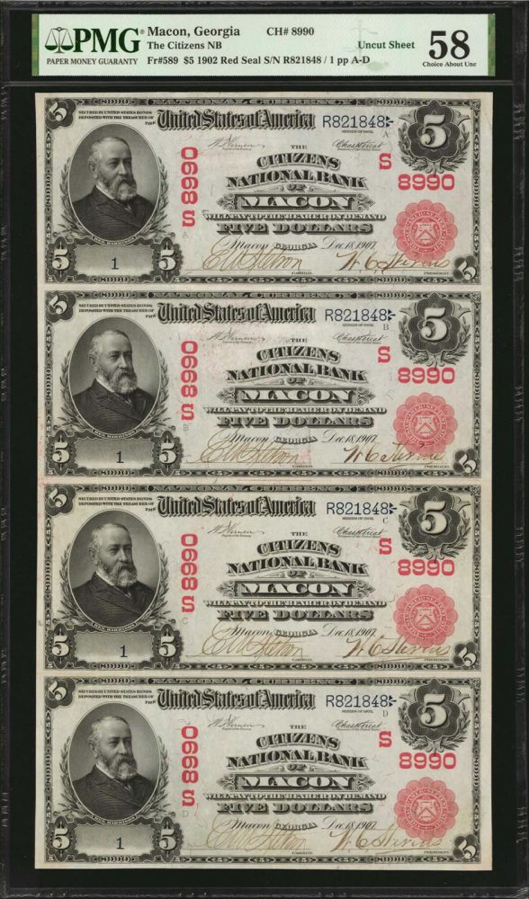 Other exceptional rarities from the August sale included a rare uncut sheet of $5 notes from Macon, Georgia that realized nearly twice the high estimate at $156,000, a uniquely styled and exceedingly rare American Bank Note Company presentation frame of Proof U.S. and World banknotes that earned $108,000, and an incredible solid serial number 9 1995 $10 BEP 12-piece set that brought $90,000.