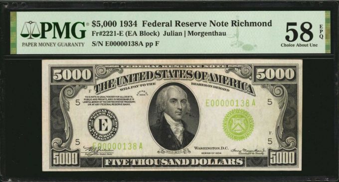 These treasures were offered alongside an array of sophisticated collections that included some of the greatest rarities of the Friedberg reference. Part II of the Tarzan Collection offered an impressive selection of rare large and small size type notes. Highlights from this cabinet included a Fr. 187j 1880 $1000 Legal Tender Note graded Very Fine 30 by PMG that sold for $144,000, and a Fr. 2221-E 1934 $5000 Richmond Federal Reserve Note graded AU 58 EPQ by PMG that brought $156,000.