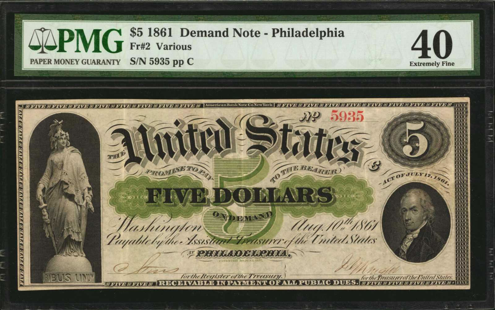 An exceptional group of high-end Demand Notes, Legal Tender Notes, and Silver Certificates were presented from the Silver Springs Collection, and featured such incredible highlights as a Fr. 2 1861 $5 Demand Note graded PMG Extremely Fine 40 that realized $18,600, a Fr. 119 1901 $10 Legal Tender Note graded PCGS Currency Gem New 66 PPQ that sold for $11,400, and a Fr. 282 1923 $5 Silver Certificate certified PMG Gem Uncirculated 66 EPQ that earned $10,800.