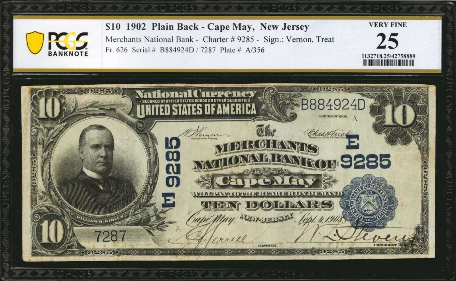 The Cape May Collection offered an unprecedented selection of Colonial and National Bank Notes of New Jersey, fittingly highlighted by a Cape May $10 1902 Plain Back graded PCGS Banknote Very Fine 25 that realized $5,040.