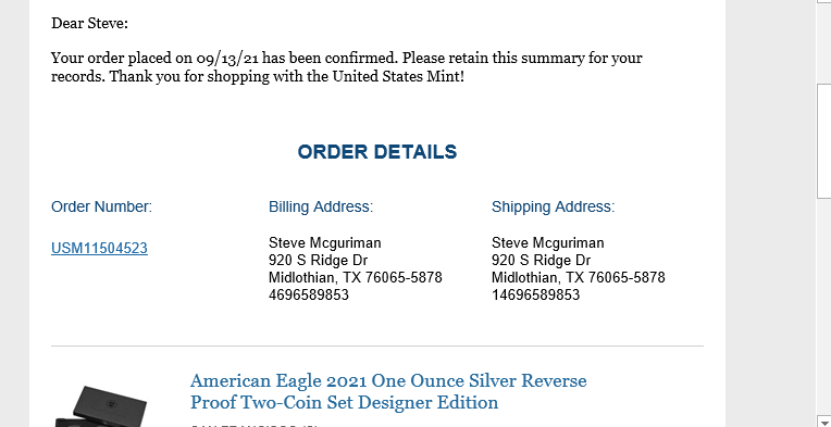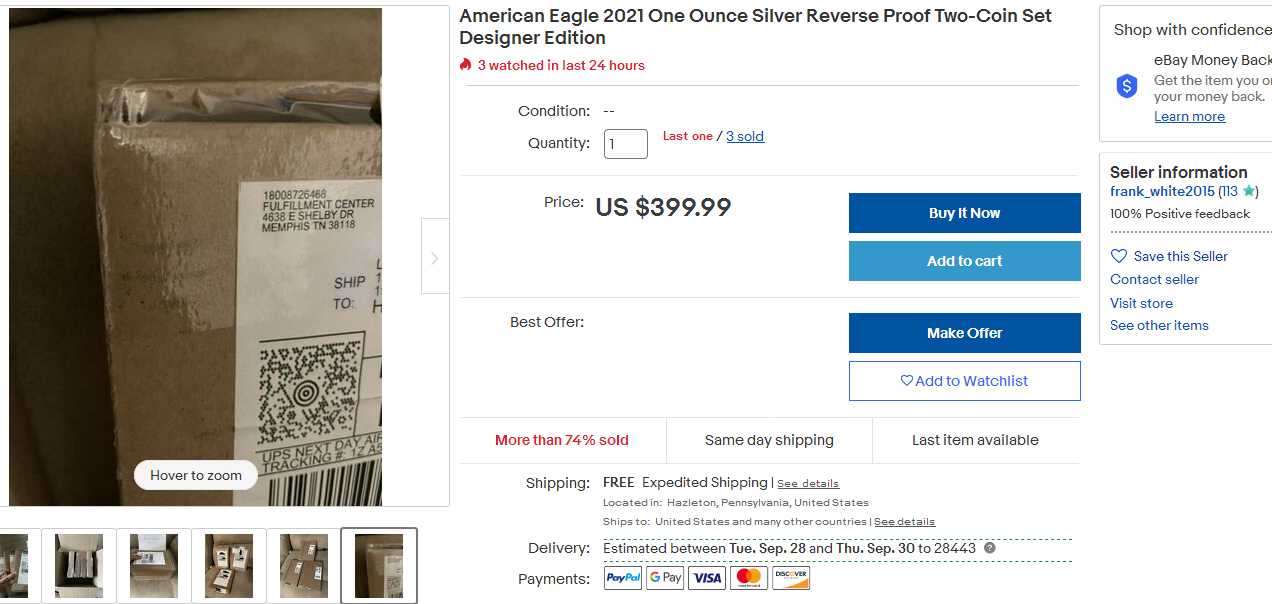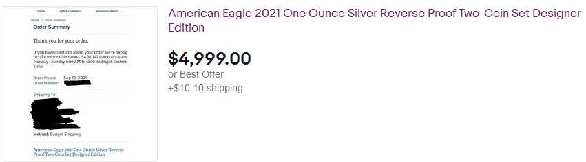 On release at Noon ET, the 2021 Reverse Proof American Silver Eagle Two-Coin Set will be available from the Mint’s online store for American Eagle coins. Pricing for the two-coin set is listed as $175.