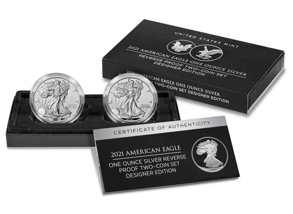 Officially named the "2021 American Eagle One Ounce Silver Reverse Proof Two-Coin Set Designer Edition," the collectible is is expected to be one of the most popular U.S. Mint products released this year because it contains a West Point Mint-struck 2021-W American Silver Eagle with the original or classic design (Type 1) and a San Francisco Mint-struck 2021-S American Silver Eagle with the new design (Type 2).