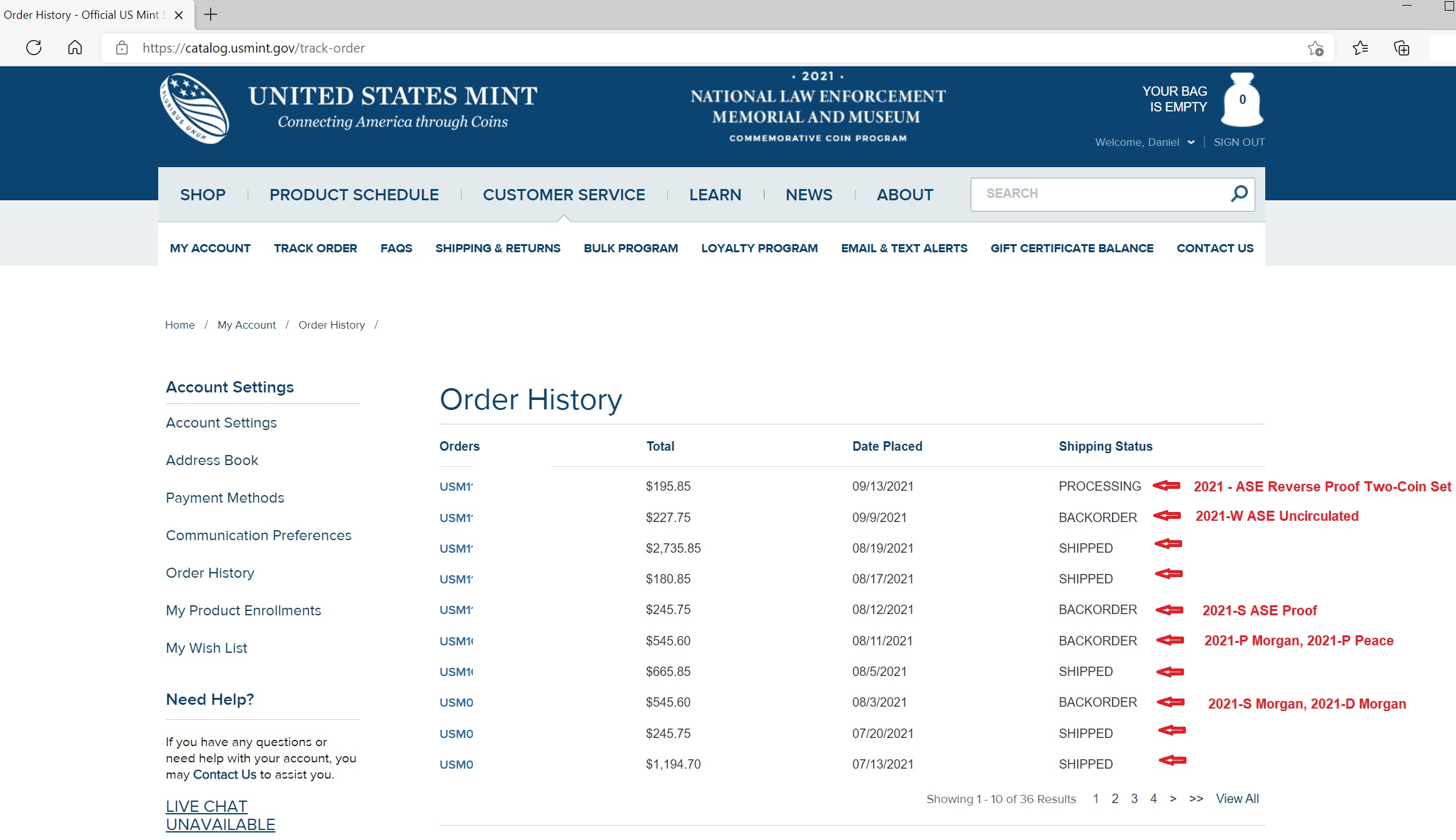 | 2021-P Uncirculated Silver Dollar | 7,927 | 7,994 | 67 | 0.85% |