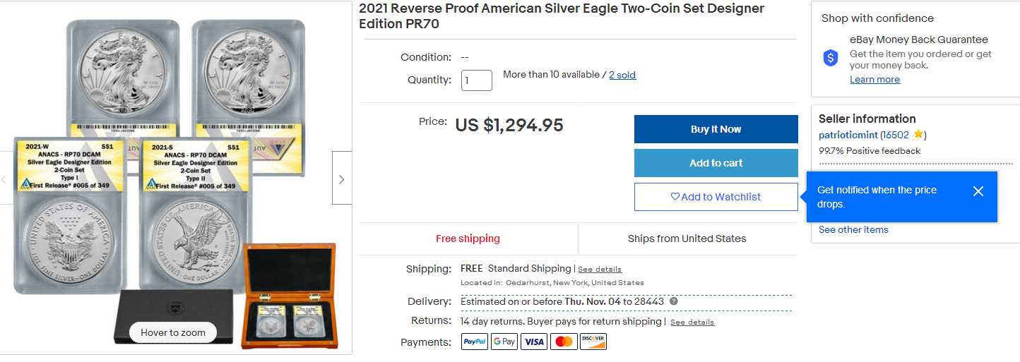 Released Sept. 13 for $175, the 125,000 limited-edition 2021 Reverse Proof American Silver Eagle Two-Coin Set saw huge demand and a resulting bottle-necked ordering system immediately on its release. The set — even with its one limit per household — lasted for less than three hours when it became unavailable. U.S. Mint stats have its sales at 124,251.