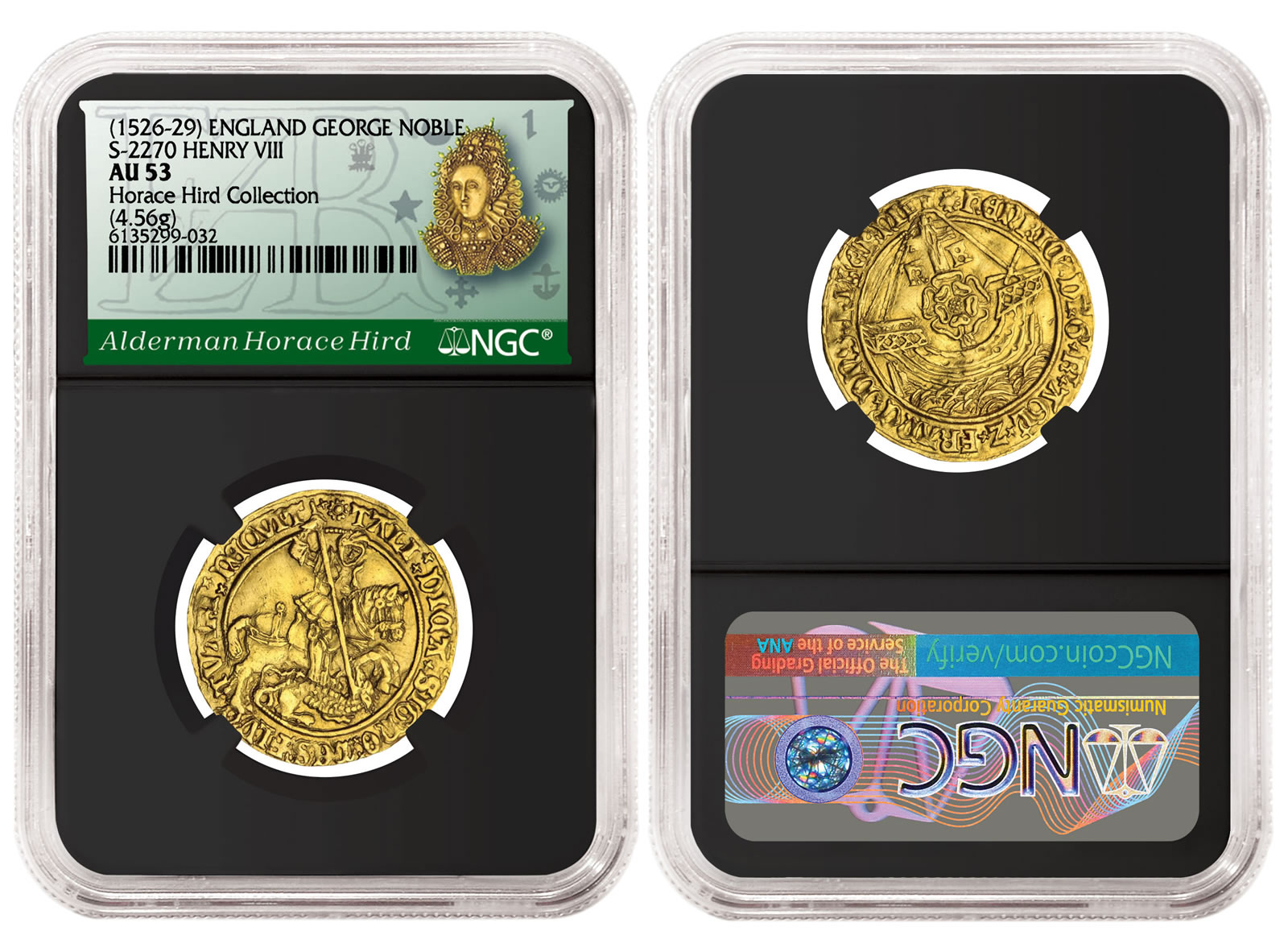 an England (1526-29) George Noble graded NGC AU 53 (lot 32) that realized £144,000 (about $195,000 USD), well over its pre-auction estimate of £40,000 to £60,000 (about $54,000 to $81,000 USD)