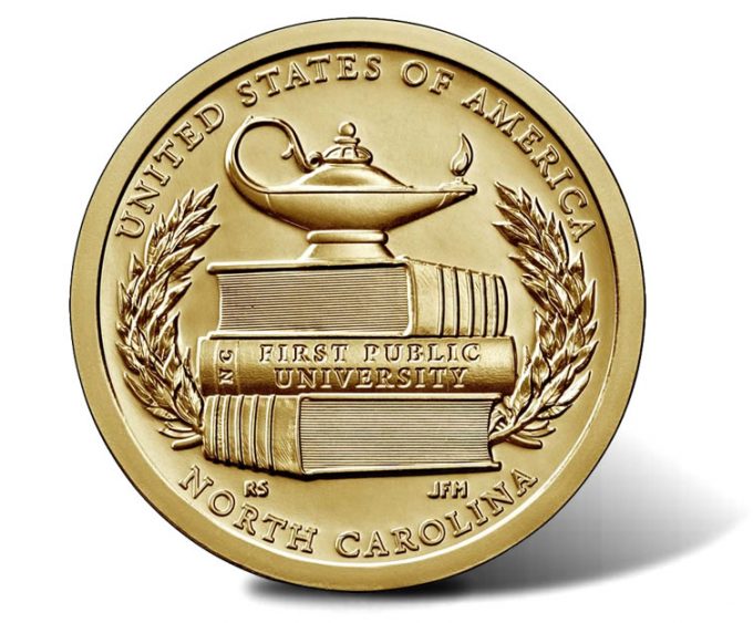 As for the North Carolina dollar, it offers a reverse (tails side) design emblematic of the University of North Carolina at Chapel Hill. This location is noted for being the nation’s first public institution of higher learning, opening in 1795, and the only public institution to confer degrees in the 18th century.
