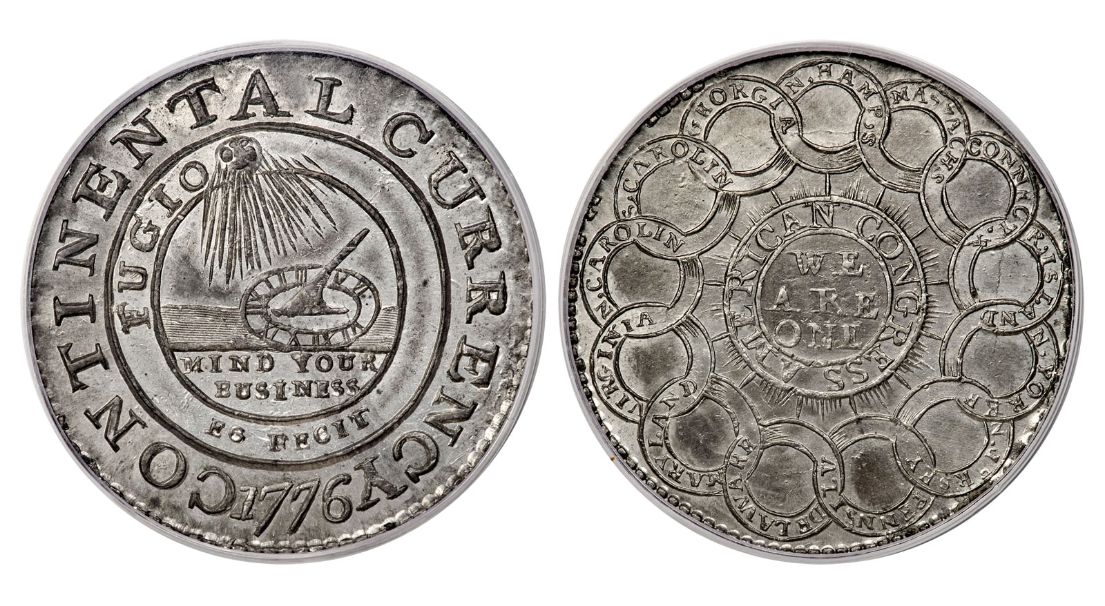 For nearly two centuries, numismatic tradition has had it that 1776 Continental dollars were struck at the behest of the Continental Congress as prototypes for an American dollar coin. The theory was the subject of debate, but an article by in the January 2018 issue of The Numismatist presented strong, if not irrefutable evidence that the Continental dollars were actually struck in Europe circa 1783, not in Revolutionary War-era America. A near-Gem example, 1776 $1 Continental Dollar, CURRENCY, Pewter, EG FECIT, MS64 PCGS. Newman 3-D, W-8460, R.4, drew a winning bid of $150,000.