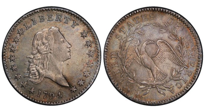 A 1794 50C O-105, T-3, High R.4, AU58+ PCGS brought a winning bid of $168,000. Because the Mint’s coining press proved inadequate to meet the demand for silver dollars, a small mintage of half dollars was achieved. Only 3-4% of the 23,464 struck — 5,300 of which were delivered in December 1794, the rest in February of the following year — or a total of roughly 800 are believed to have survived in all grades.