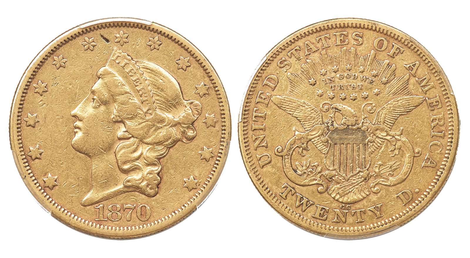 The 1870-CC double eagle in this auction is a new discovery, an heirloom passed down family lines for several generations. It was completely unknown to the collecting world until recently. Only about 60 survivors from the small 1870 mintage of just 3,789 pieces are known in all grades.