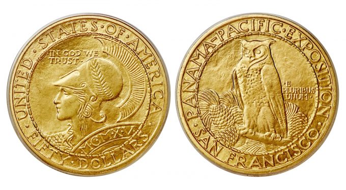 From the first coinage of $50 gold pieces for the Panama-Pacific International Exposition, a 1915-S $50 Panama-Pacific 50 Dollar Round MS65 PCGS rode 68 bids to $180,000. This is a round version of the coin that enjoyed a celebrated release in octagonal form, and the attention showered upon the eight-sided version left its round counterparts largely overlooked; as a result, the round version is the rarer of the variants, and more valuable in high grade.