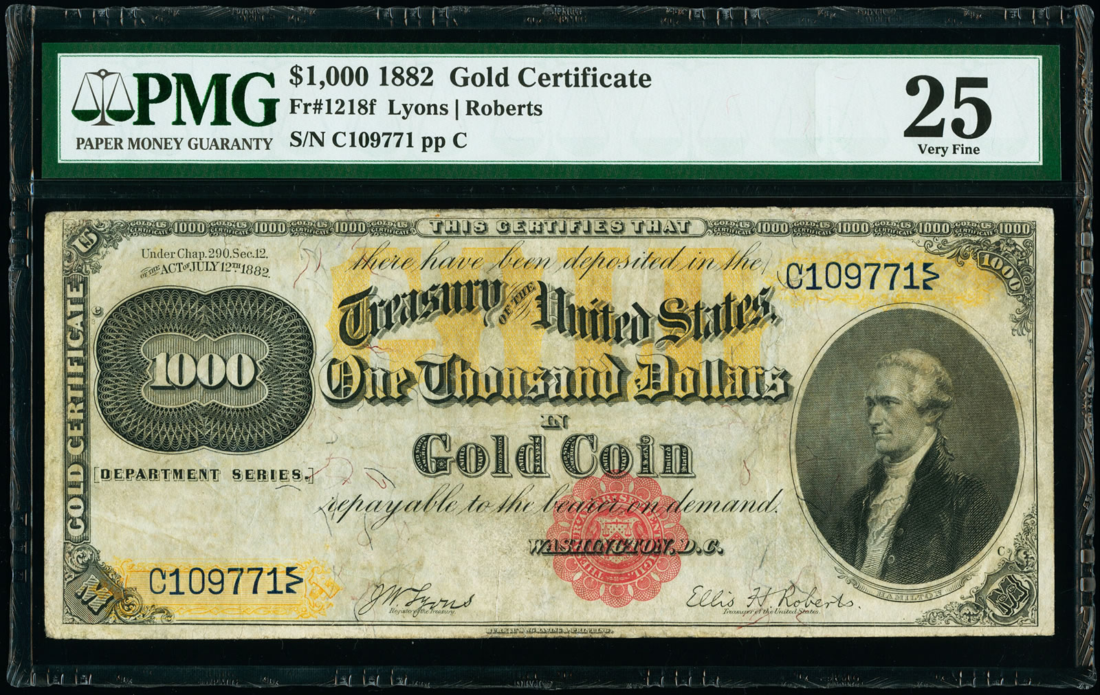 A Fr. 1218f $1,000 1882 Gold Certificate PMG Very Fine 25, from the Yuri Solovey High Denomination Collection, brought a winning bid of $192,000. Series 1882 $1,000 Gold Certificates are listed as eight different significant numbers in Paper Money of the United States by Ira and Arthur Friedberg, with each featuring different signature combinations as the offices of Register of the Treasury and Treasurer of the United States turned over. Just 96,000 examples were printed in total, and the high face value, coupled with the Gold Reserve Act of 1934 under Roosevelt, resulted in massive redemption rates. Just 11 examples are listed in the census by serial number, including one piece which is off the market permanently in the holdings of the Federal Reserve Bank of San Francisco.