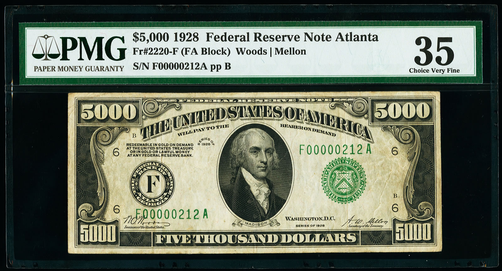 A Fr. 2220-F $5,000 1928 Federal Reserve Note. PMG Choice Very Fine 35, from a series in which notes were printed for just nine of the 12 Federal Reserve Banks, climbed to $150,000. Also from the Yuri Solovey High Denomination Collection, this Atlanta example is one of only about 20 survivors known from all districts combined. The small total is a result of miniscule print runs compared to most 20th century printing totals, with just 1,440 notes printed and released through the Atlanta District.