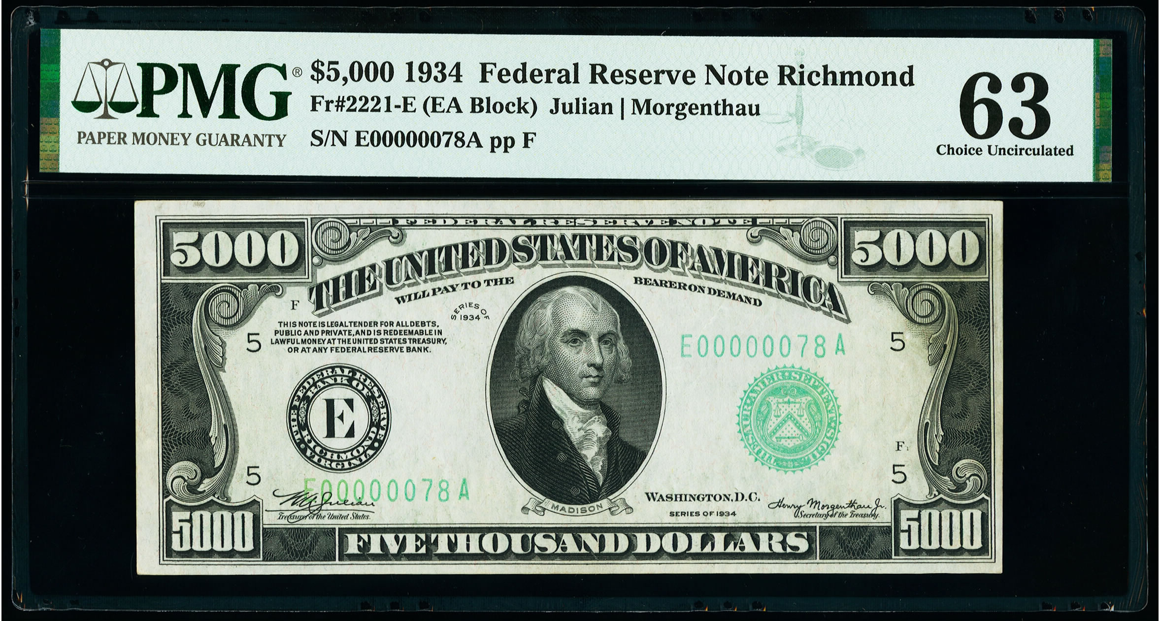 - A Fr. 2221-H $5,000 1934 Federal Reserve Note. PMG Very Fine 25: $93,000