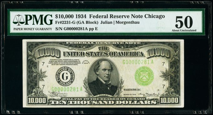 The Fr. 2231-G $10,000 1934 Federal Reserve Note. PMG About Uncirculated 50 is a strong example for the grade among notes of this denomination, which have seen steadily rising prices in the last couple of years. The result exceeds what would be the note’s buying power in the current economy: $10,000 in 1934 equates to roughly 200,000 today.