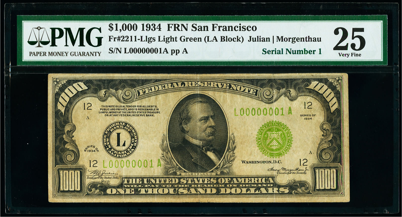 Another outstanding piece from the Yuri Solovey High Denomination Collection and the San Francisco District, a Serial Number 1 Fr. 2211-L $1,000 1934 Light Green Seal Federal Reserve Note. PMG Very Fine 25 reached $126,000. This example is the only reported No. 1 $1,000 Federal Reserve Note outside of government hands.