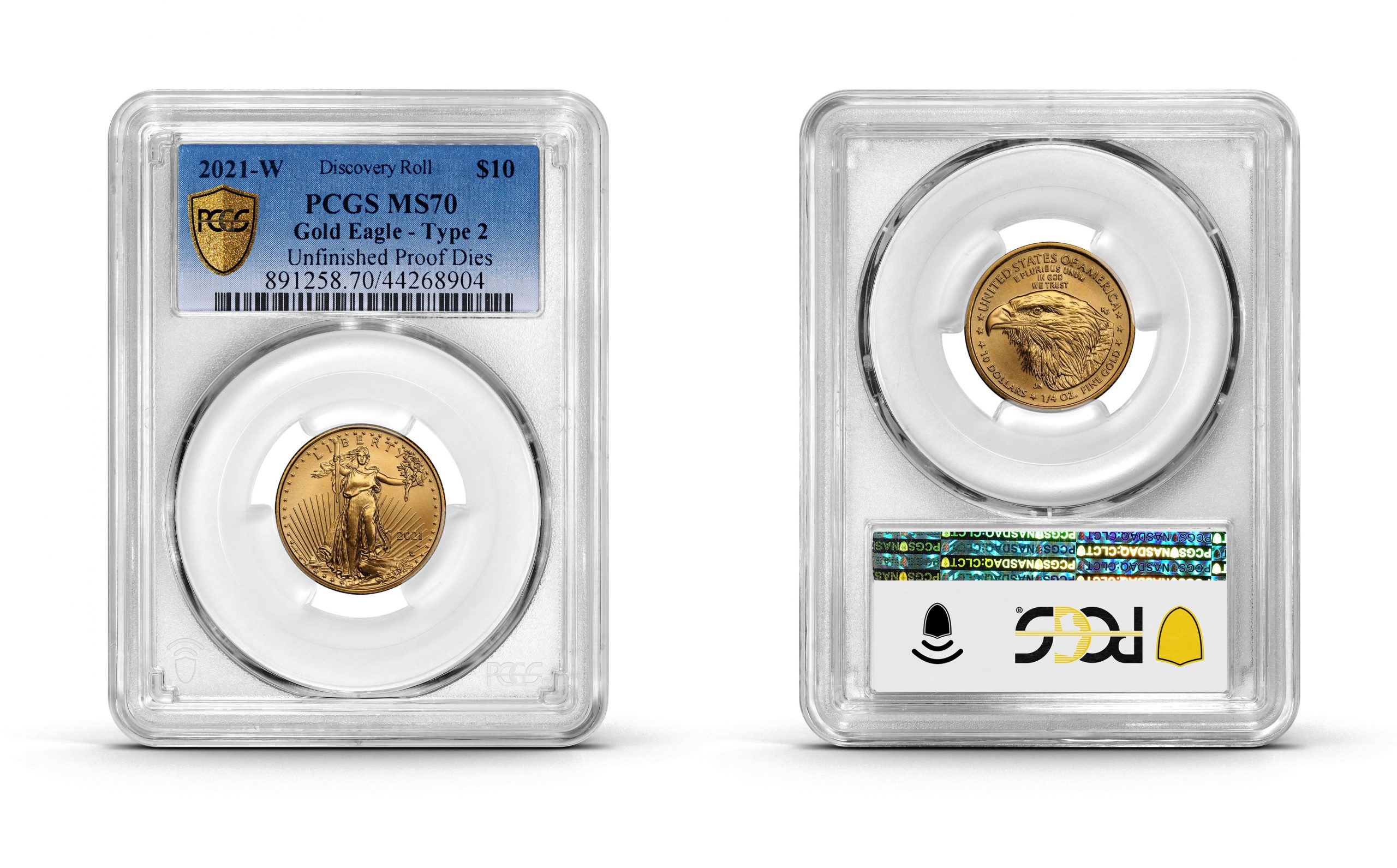 "When Ian Russell and PCGS President Stephanie Sabin showed me a few groups of raw gold coins, Ian first handed me a standard business strike 2021 Type 2 quarter-ounce American Gold Eagle and then one in proof. I was wondering where this was going since these two coins are extremely common. I immediately started thinking that the reason for the visit could be a cool repeating ‘struck through’ error or even a newly discovered ‘mule.’ My mind was racing," said Feltner.