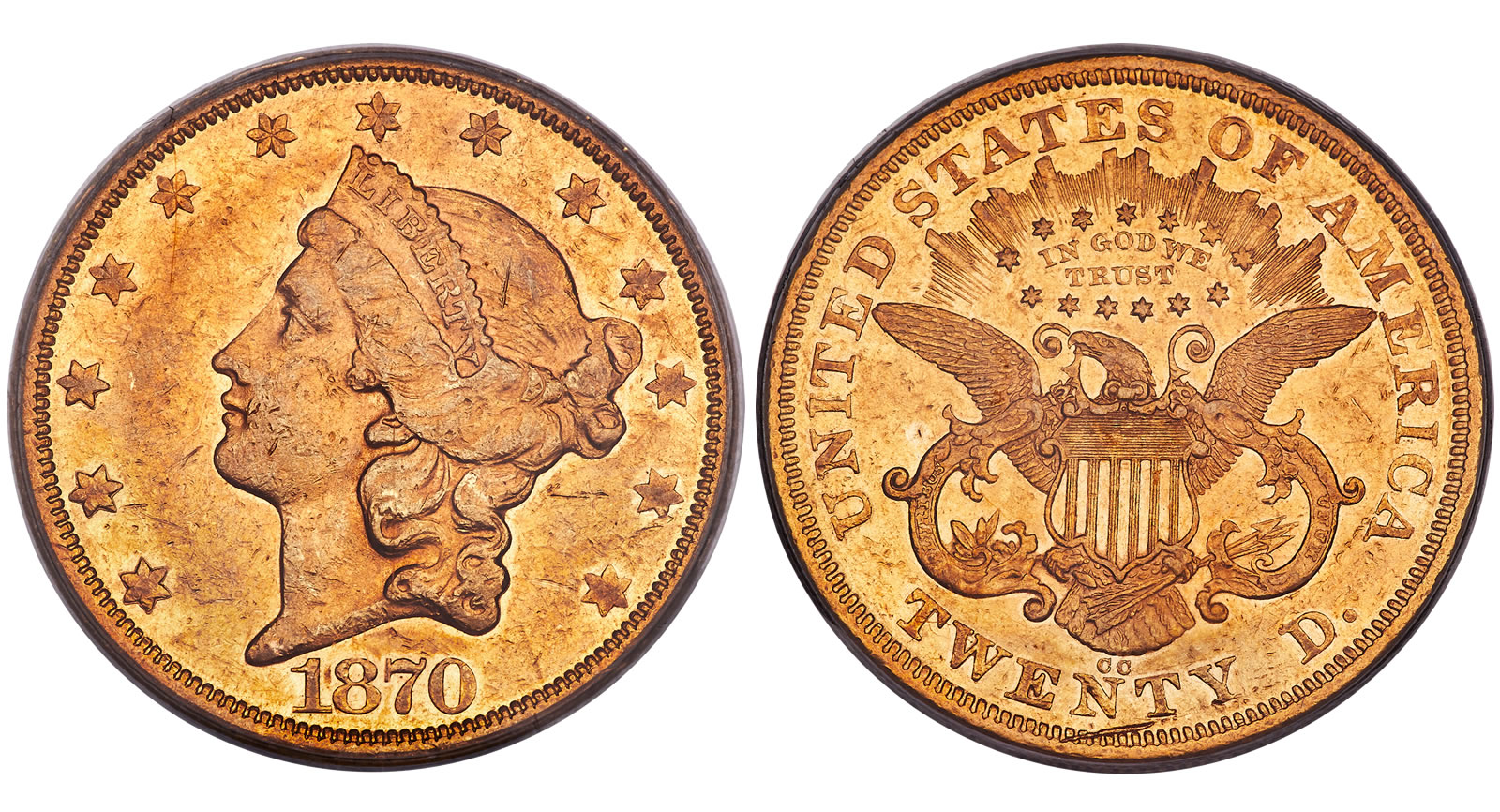 - An 1870-CC $20 AU53 PCGS. Variety 1-A
