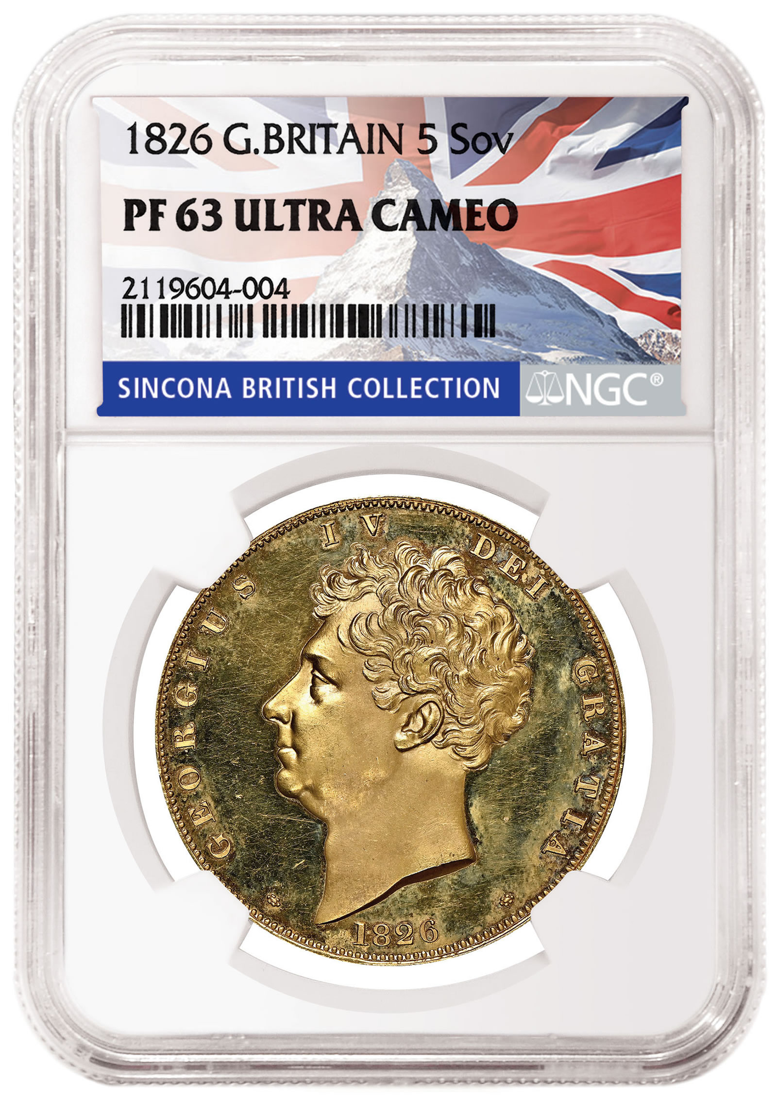 The sale features several other Proof Sets, including an 1826 one issued under King George IV (lot 828). It is led by a 5 Sovereign graded NGC PF 63 Ultra Cameo and includes 10 other coins.