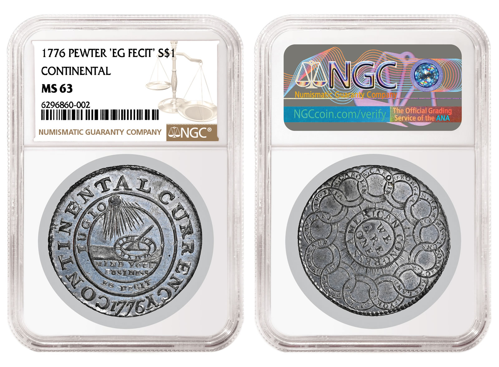 A 1776 Pewter ‘EG FECIT’ Continental Dollar graded NGC MS 63 (lot 1037) has an estimate of £30,000 to £40,000 (about $40,000 to $54,000). Another 1776 Pewter ‘EG FECIT’ Continental Dollar is graded NGC MS 62 (lot 1038) and also has an estimate of £30,000 to £40,000 (about $40,000 to $54,000).