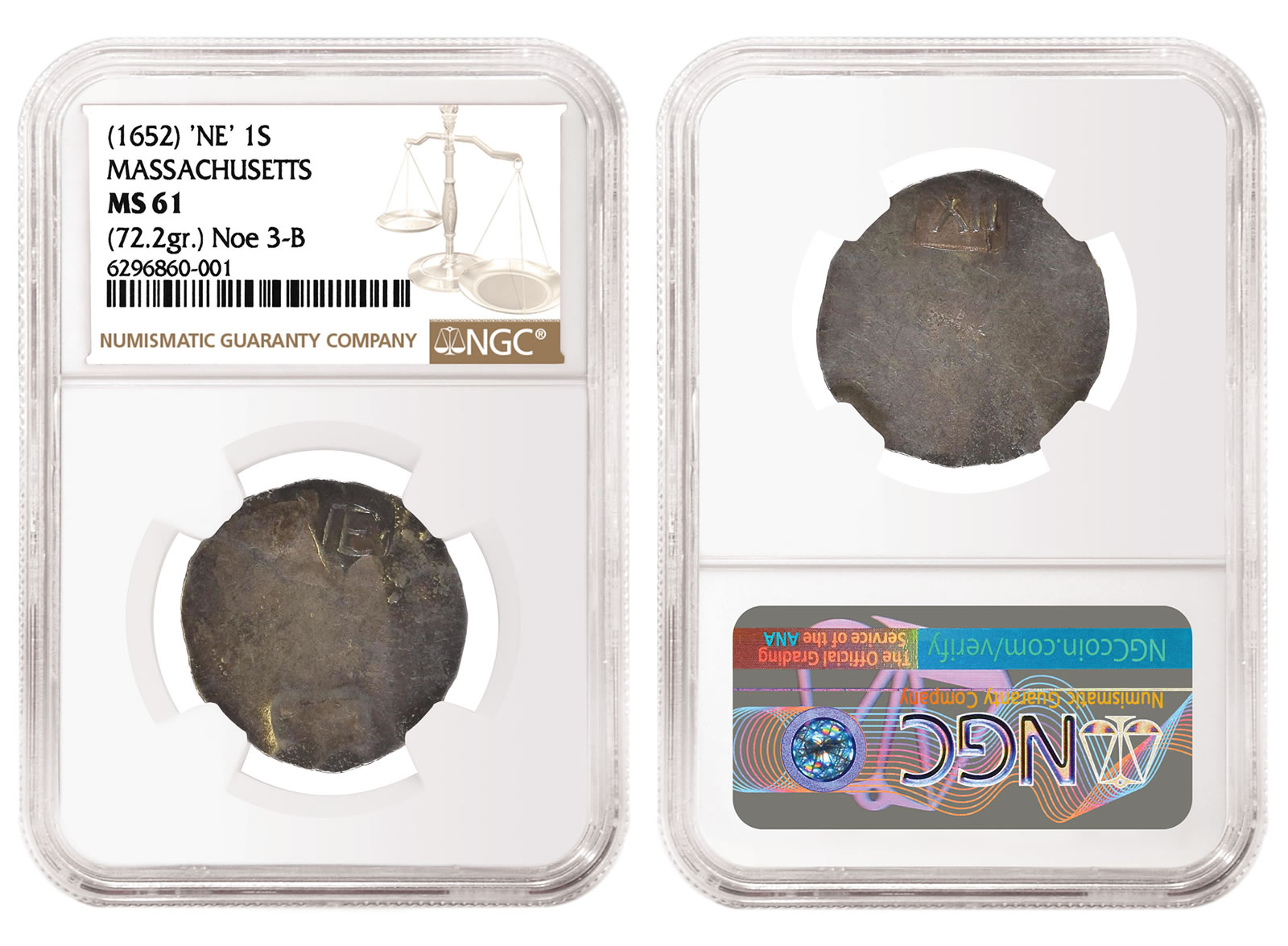 The Massachusetts (1652) ‘NE’ Shilling graded NGC MS 61 (lot 1034) has an estimate of £150,000 to £200,000 (about $201,000 to $268,000). It is the only one of its type to have earned a Mint State grade.