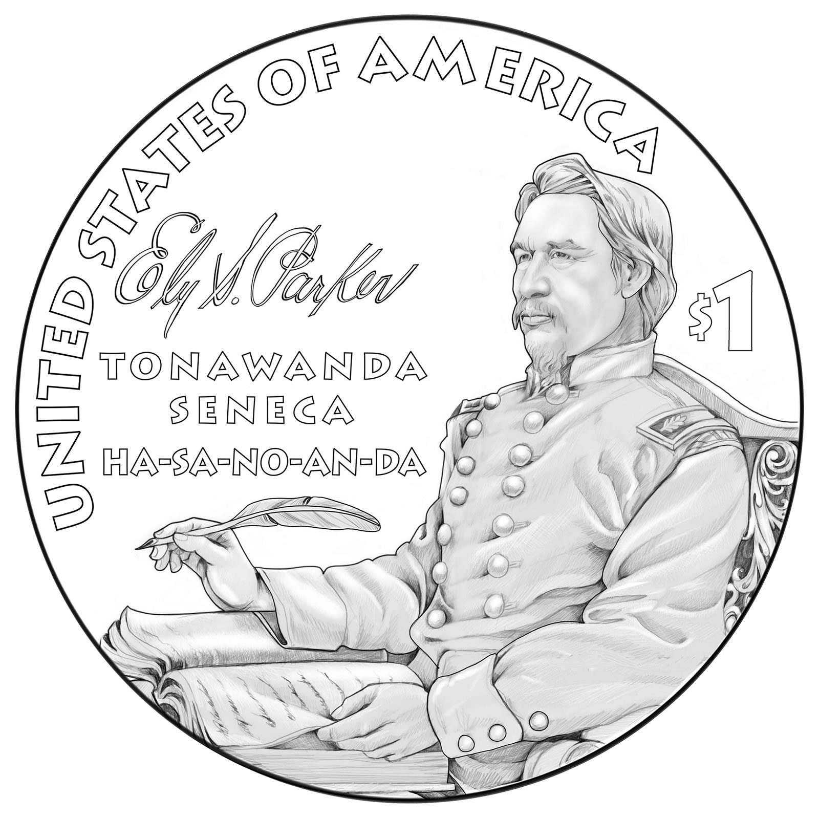 Reverse inscriptions include "$1," UNITED STATES OF AMERICAN," "TONAWANDA SENECA" and "HA-SA-NO-AN-DA" The last two recognize Parker’s tribe and the name given to him at birth.