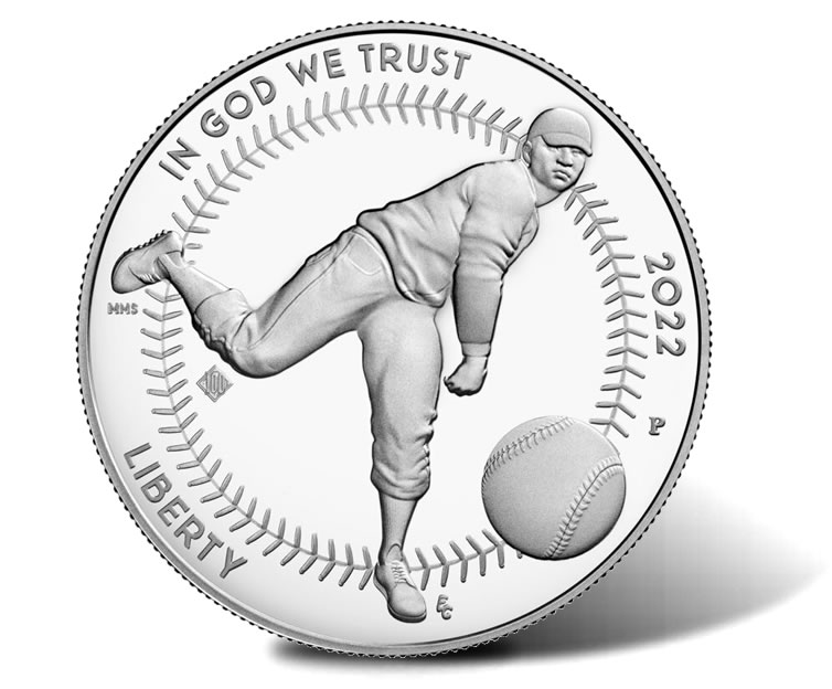 As for the silver dollar, its obverse shows a pitcher in mid-throw with the baseball in the foreground and baseball stitching as a border. Inscriptions are "IN GOD WE TRUST," "2022," and "LIBERTY." Matt Swaim designed the obverse and Eric David Custer sculpted it.