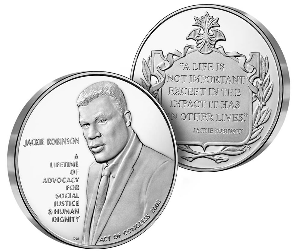 The medal’s reverse features laurel branches surrounding a plaque containing the inscriptions "A LIFE IS NOT IMPORTANT EXCEPT IN THE IMPACT IT HAS ON OTHER LIVES" and "JACKIE ROBINSON."