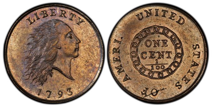 - 1793 S-1 Flowing Hair "Chain AMERI" large cent, graded PCGS SP65;
