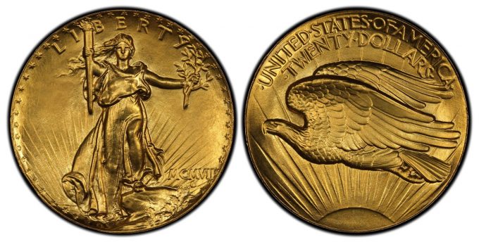- 1907 Ultra High Relief double eagle, PCGS PR68, ex. Augustus Saint-Gaudens estate.