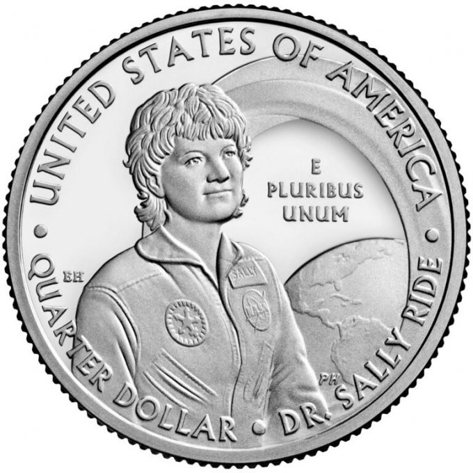 This design depicts Dr. Ride next to a window on the space shuttle, inspired by her quote, "But when I wasn’t working, I was usually at a window looking down at Earth." The inscription "E PLURIBUS UNUM" is intentionally positioned over the Earth next to America, indicating that out of all women in the United States, Dr. Ride was the first into space. The additional inscriptions are "UNITED STATES OF AMERICA," "QUARTER DOLLAR," and "DR. SALLY RIDE."