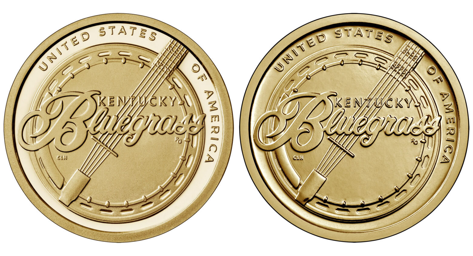 The Kentucky $1 Coin pays homage to the home of bluegrass music. This design features a banjo, an important bluegrass instrument, tilted to one side, alluding to the rhythm and movement of the music. Inscriptions include "UNITED STATES OF AMERICA," "BLUEGRASS," and "KENTUCKY."