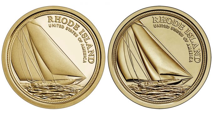 The Rhode Island $1 Coin design depicts Nathanael Herreshoff’s famous Reliance yacht at full speed in the waters surrounding Rhode Island. The design is bordered by a rope evoking the nautical scene. Inscriptions include "UNITED STATES OF AMERICA" and "RHODE ISLAND."