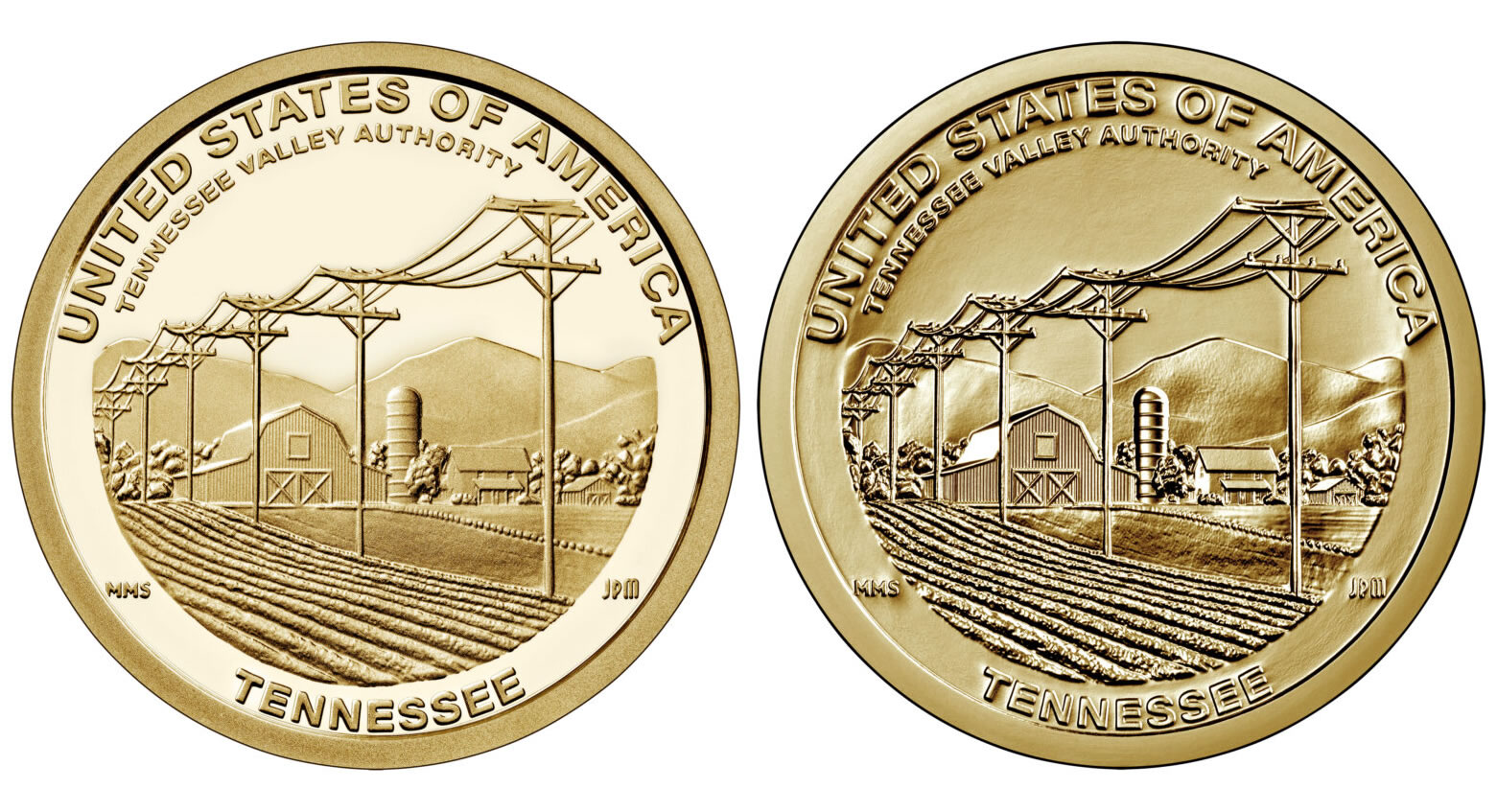 The Tennessee $1 Coin design depicts a Tennessee farm with newly installed power lines lining the road. Inscriptions include "UNITED STATES OF AMERICA," "TENNESSEE VALLEY AUTHORITY," and "TENNESSEE."