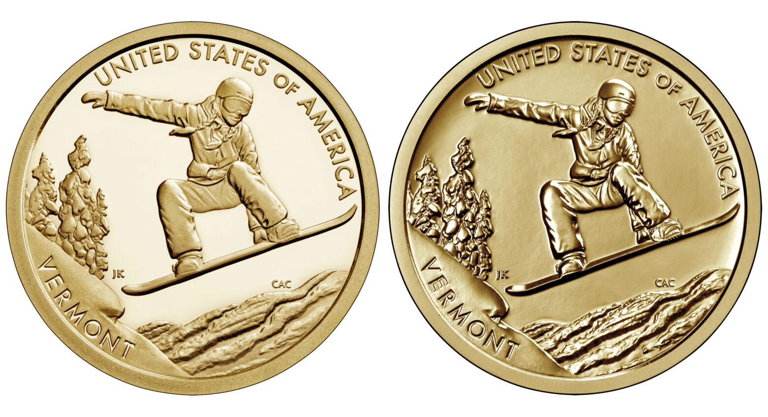 The Vermont $1 Coin features a young female snowboarder in the air performing a trick called a "melon grab," set against a mountainous winter skyline inspired by the landscape of Vermont. The aim of the design is to capture a sense of the energy and exuberance of snowboarding through movement implied by diagonal lines and curved shapes. Inscriptions include "UNITED STATES OF AMERICA" and "VERMONT."