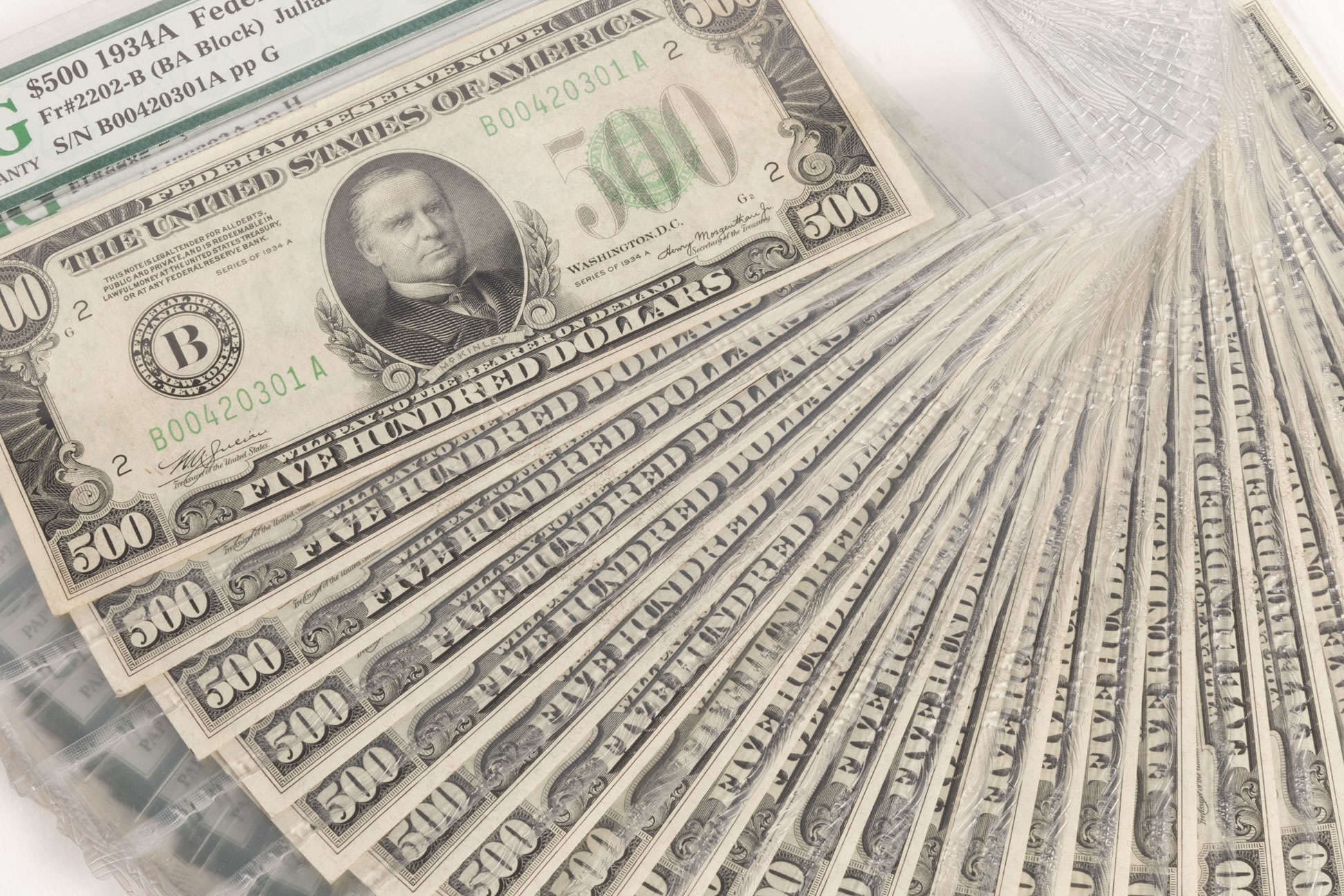 "It is astounding that an original pack of 100 $500 notes with a combined face value of $50,000 survived since the Great Depression era. According to the U.S. Treasury Department, the average annual salary in the United States in 1934 was less than $1,400. In 2022 dollars, that $50,000 pack would have been worth the equivalent of about $1 million when the notes were printed," said Matthew Duncan, co-owner/general manager of U.S. Coins and Jewelry. "We are delighted that these are the first banknotes certified as a pack by PCGS."