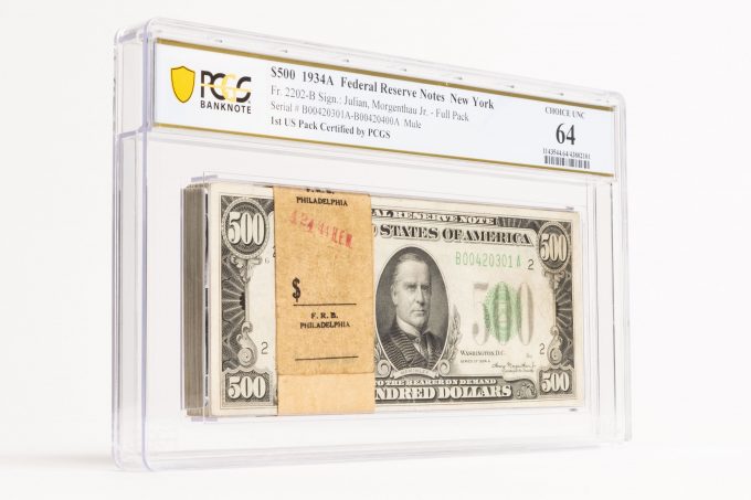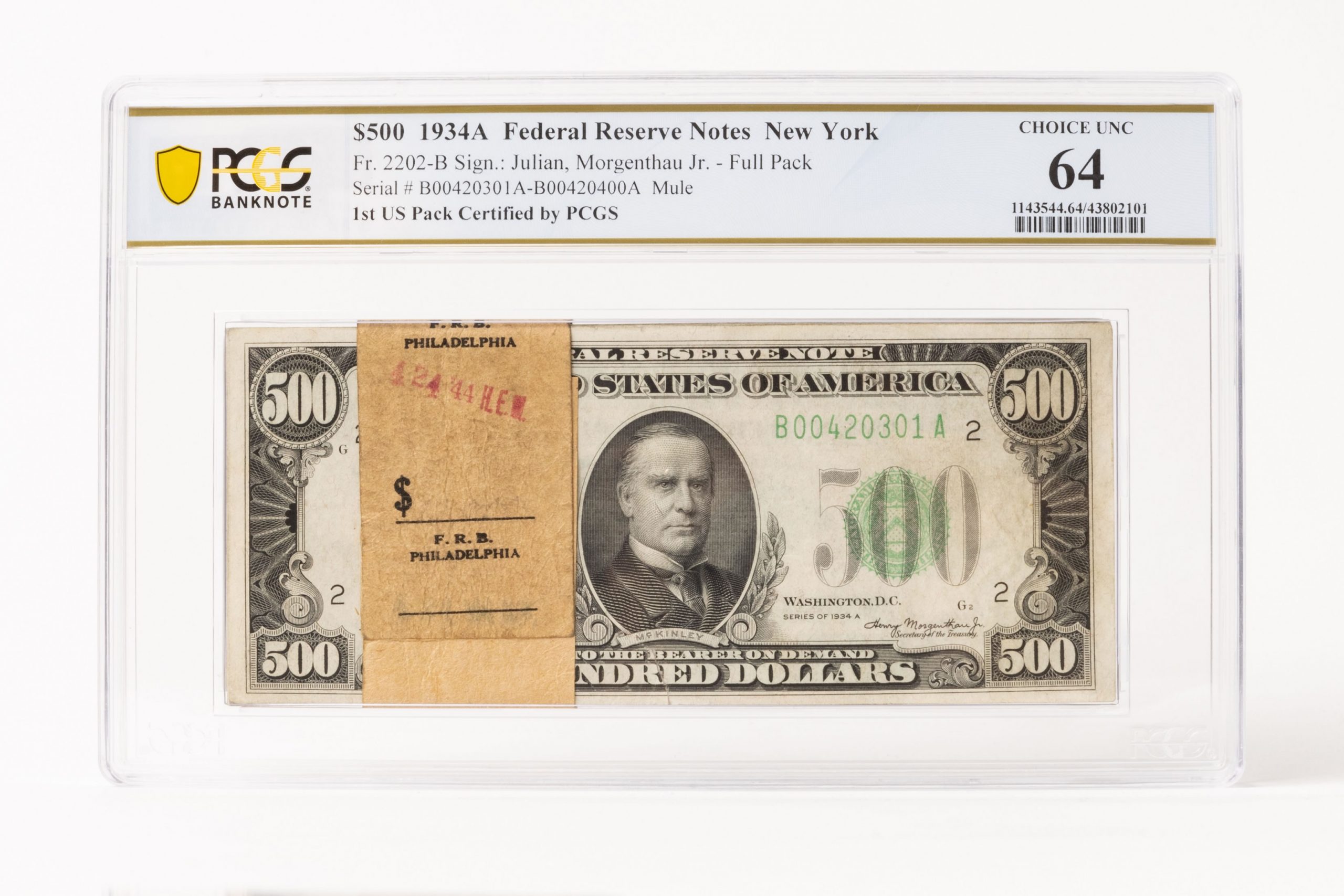 A full 100-note consecutively numbered pack of Series 1934A $500 Federal Reserve Notes is the first submission under a new banknote pack grading and encapsulation program that Professional Coin Grading Service (www.PCGS.com) will soon be debuting in the United States.