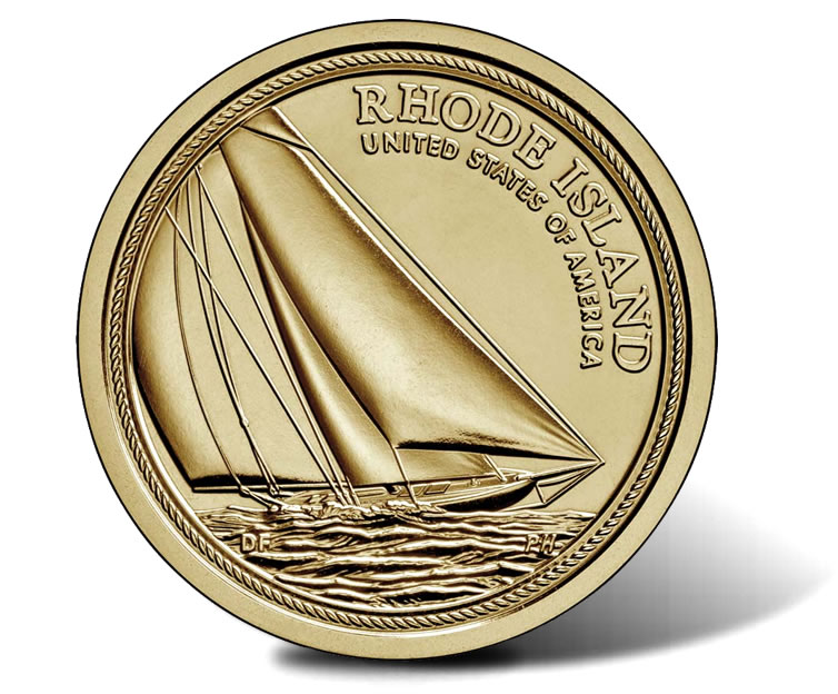 Nathanael Herreshoff’s famous Reliance yacht sailing the water appears on the reverse (tails side) of the Rhode Island dollar. The yacht was built in 1891 and incorporated numerous technical innovations.