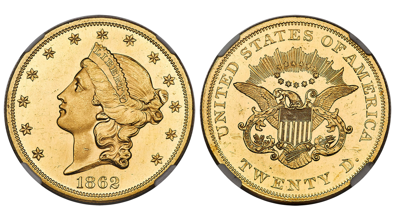 The 1862 Liberty Double Eagle, MS63+★ is the most elusive Type One Liberty double eagle from the Philadelphia Mint, excluding the uncollectible 1861 Paquet Reverse, and examples in any grade remain scarce. Eight were recovered from the wreck of the S.S. Republic, and another in the treasure of the S.S. Brother Jonathan, but no large hoards have been uncovered; the surviving population in all grades has been estimated at 150-200 specimens, most in the XF-AU range. This specimen is the second-finest certified example at both of the leading grading services, thanks to its Plus and Star designations.
