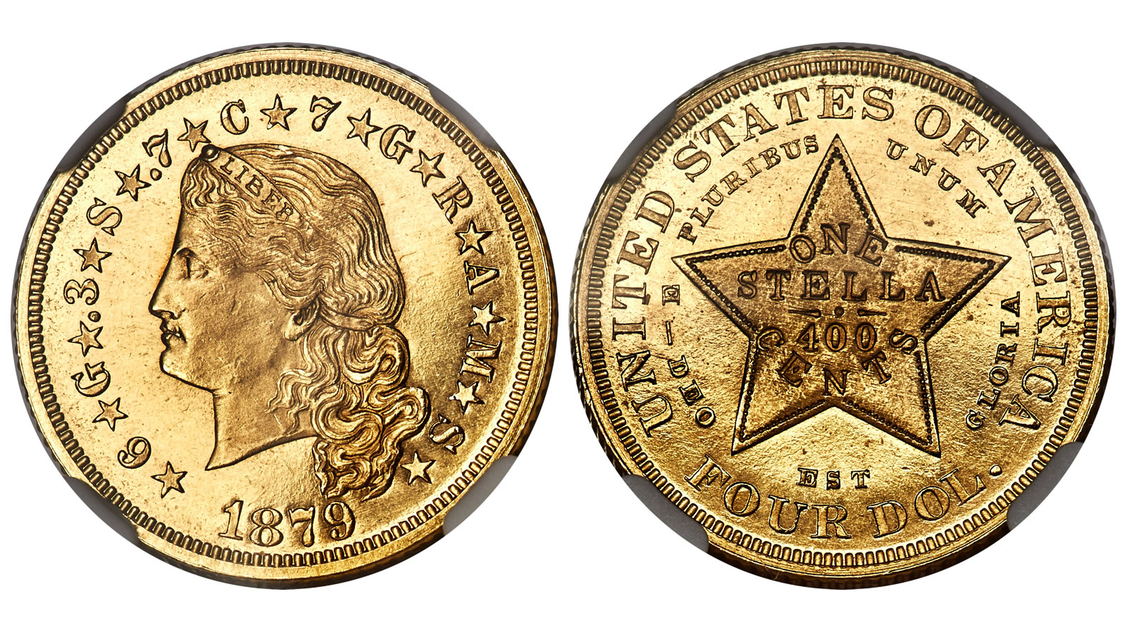 The 1879 Flowing Hair Stella, Judd-1635, Pollock-1833, JD-1, R.3, PR65 Cameo NGC that brought the event’s top price was one of two Flowing Hair stellas leading the final results. Another 1879 Flowing Hair Stella, Judd-1635, Pollock-1833, JD-1, R.3, PR65 NGC brought a winning bid of $174,000.