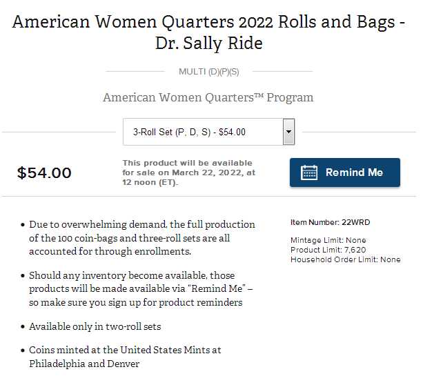Due to overwhelming demand, the full production inventory for the AWQ Sally Ride rolls and bags (100 COIN BAG -P (22WBC), 100 COIN BAG – D (22WBD), 2 ROLLS – P&D (22WRC), AND 3 ROLLS – P,D,S (22WRD), scheduled to go on sale March 22, 2022, will soon be accounted for through enrollments.