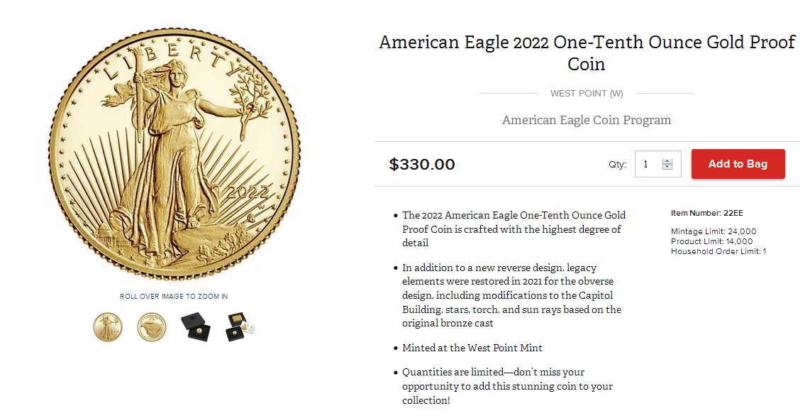 | 2022 $5 American Eagle Gold Proof Coin (1/10 oz.) | 14,000 | 24,000 | $330.00 |