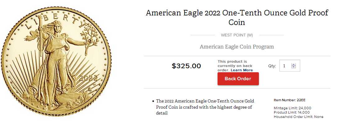 | 2022-W Proof $5 Gold Coin | 1,745 | 1,925 | 180 | 10.32% |
