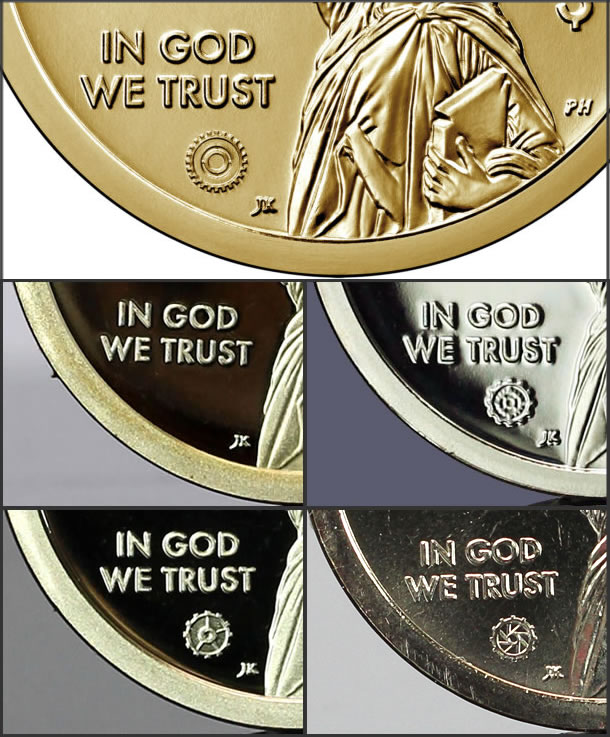 Excluding the introductory 2018 dollar, obverses also carry a privy mark of a stylized gear which represents industry and innovation. The gear’s depiction has changed annually, as highlighted by the following images.