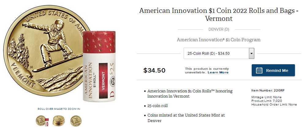 The United States Mint today at noon ET releases the Vermont American Innovation dollar, the second of four program strikes to appear this year as a part of their American Innovation® $1 Coin Program. Products include 25-coin rolls and 100-coin bags containing Vermont dollars in an uncirculated finish for collectors.