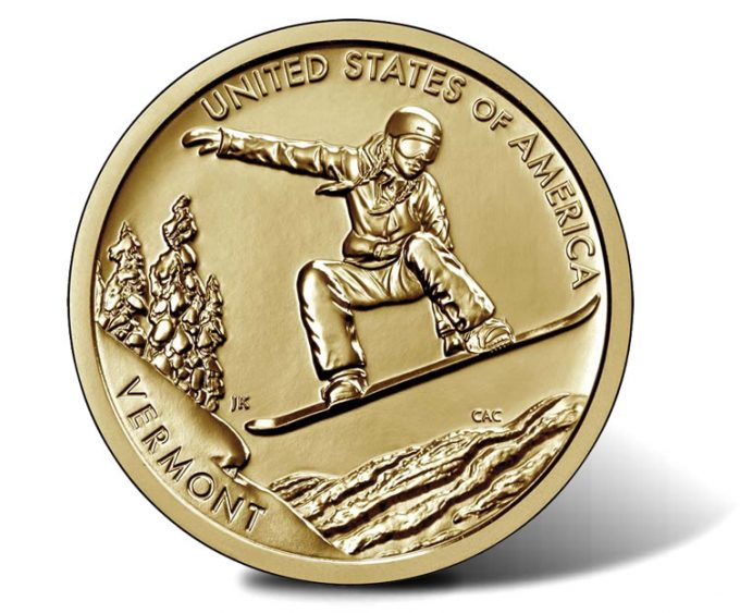 Vermont dollars showcase a reverse (tails side) celebrating the extreme sport of snowboarding. Created by Justin Kunz and sculpted by Craig Campbell, the design features a young female snowboarder in the air performing a trick called a "melon grab." The scene contrasts against a mountainous, Vermontian skyline.