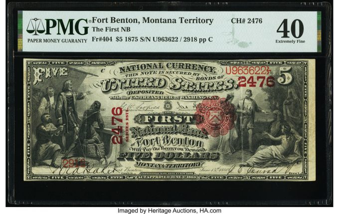 A Fort Benton, Montana – $5 1875 Fr. 404 The First National Bank Ch. # 2476 PMG Extremely Fine 40 (estimate: $25,000)