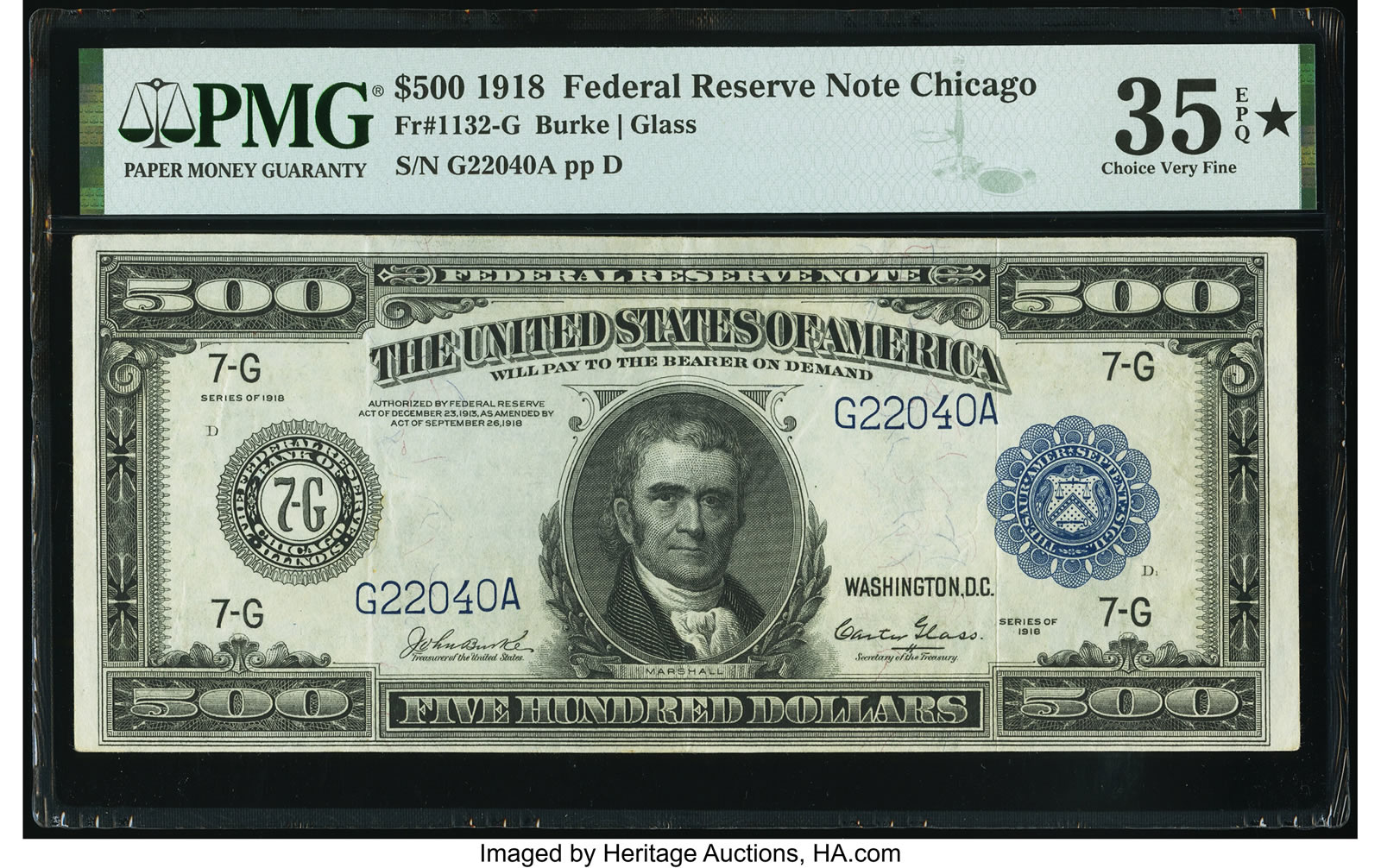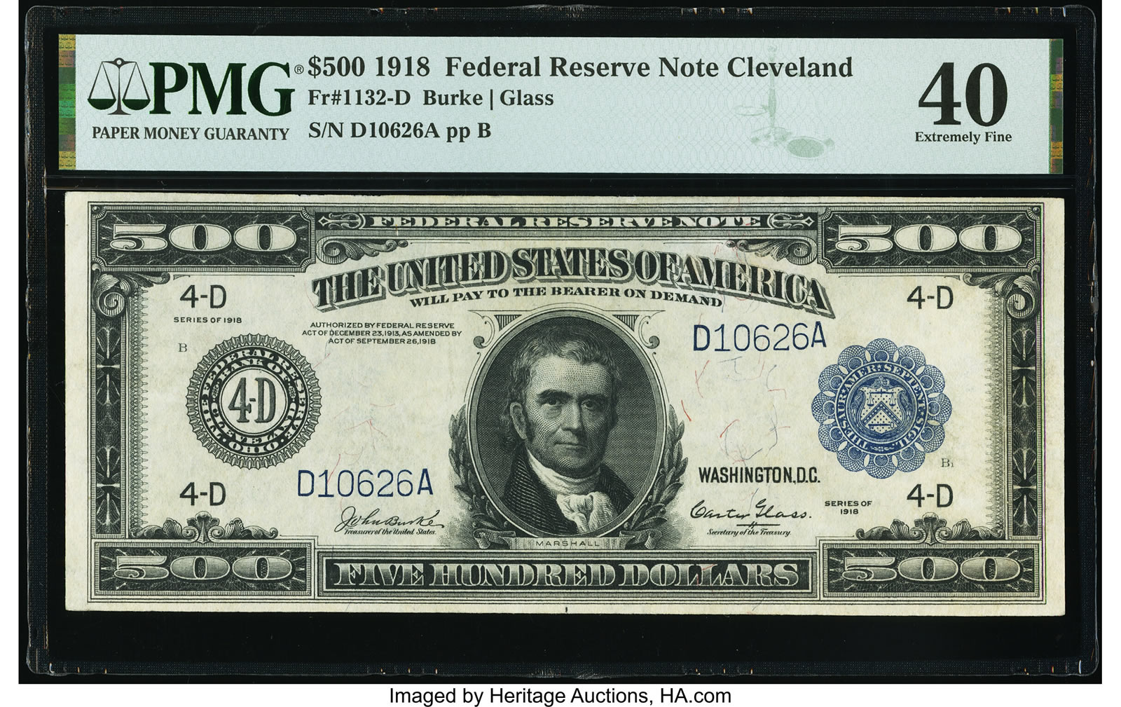 A Fr. 1132-D $500 1918 Federal Reserve Note PMG Extremely Fine 40 (estimate: $35,000)