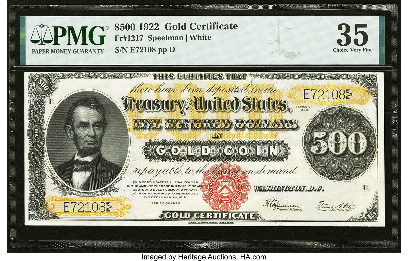 A Fr. 1217 $500 1922 Gold Certificate PMG Choice Very Fine 35 (estimate: $25,000)