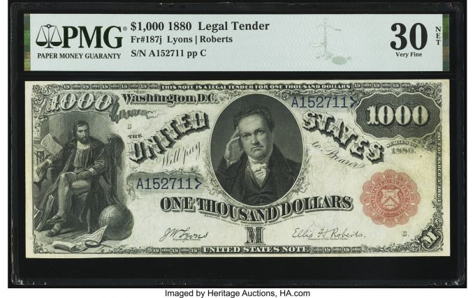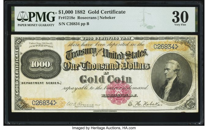 Alexander Hamilton served as Secretary of the Treasury from 1789-95, and preferred a monometallic gold standard, but eventually he authorized the issue of bimetallic currency at a fixed 15:1 ratio of gold to silver. The Fr. 1218e $1,000 1882 Gold Certificate PMG Very Fine 30 is an absolute rarity coveted by serious collectors.