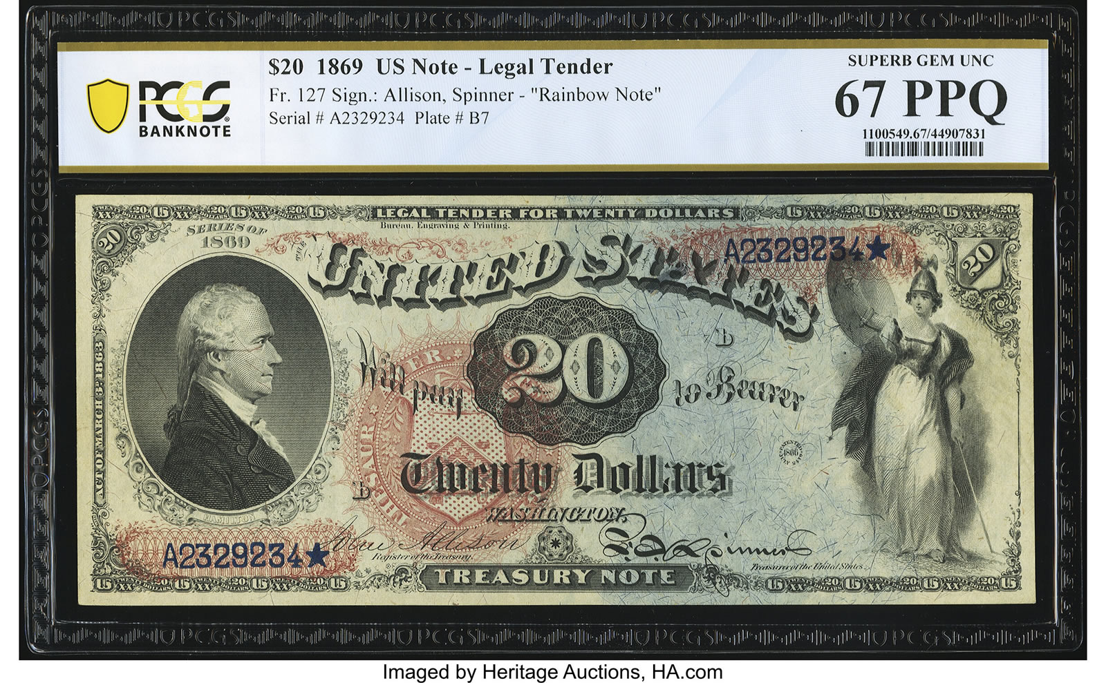 A magnificent Fr. 127 $20 1869 Legal Tender PCGS Banknote Superb Gem Unc 67 PPQ (estimate: $100,000+) has earned the highest grade for a Fr. 127, as reported by Track & Price, a mark matched from one of the major grading services by just three other examples of this note.